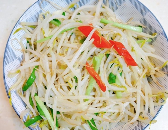 - 最後撒上蔥綠段,滴幾滴香油,再大火快炒個10-15秒,馬上關火起鍋!整個過程要快狠準,豆芽才會保持爽脆。