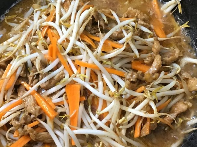 - 看到豆芽稍微有點變軟(但還是挺的狀態),把炒過的肉絲倒回鍋裡。